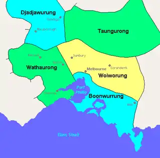 - Wathaurong (Wadha-wurrung): spoken by 15 clans south of the Werribee River and the Bellarine Peninsula to Streatham. Referred to by Europeans as the Barrabool people. The escaped convict, William Buckley lived with this community for 32 years, between 1803 and 1835, before being found by John Batman on 6 July 1835.