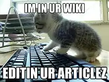 "Ceiling Cat" is a character spawned by the meme. The original image was an image macro with a picture of a cat looking out of a hole in a ceiling, captioned "Ceiling Cat is watching you masturbate."[31] There followed numerous examples with the format "Ceiling Cat is watching you [verb ending in / rhyming with -ate]" with Ceiling Cat superimposed in the upper left hand corner of an image macro depicting the appropriate action. The underlying theme is that the cat is looking down on one, almost in a form of judgment. "Ceiling Cat" and the corresponding "Basement Cat" (a black cat who lives in the basement) represent good and evil in the lolcat universe, and in some cases God and Satan, as in the LOLCat Bible Translation Project.[1][32][33] Ceiling Cat by Eva & Franco Mattes, a 2016 taxidermy cat installation mimicking the meme, is in the collection of the San Francisco Museum of Modern Art.[34]