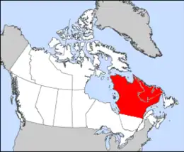 The Labrador Peninsula (French: Péninsule du Labrador), also known as the Quebec-Labrador Peninsula (French: Péninsule du Québec-Labrador), is a large peninsula in eastern Canada. It is bounded by Hudson Bay to the west, the Hudson Strait to the north, the Labrador Sea to the east, and the Gulf of Saint Lawrence to the southeast. The peninsula includes the region of Labrador, which is part of the province of Newfoundland and Labrador, and the regions of Saguenay–Lac-Saint-Jean, Côte-Nord, and Nord-du-Québec, which are in the province of Quebec. It has an area of 1,400,000 km2 (541,000 sq mi).