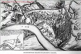The economic decline of Buda was characterised by the stagnation of population, which was not larger in 1686, than the population of the city two centuries earlier in the 15th century.[3] The Ottomans allowed the Hungarian royal palace to fall into ruins.[4] The disused palace was later transformed into a gunpowder storage and magazine by the Ottomans,[5] which caused its detonation during the siege in 1686. The original Christian Hungarian population did not feel secure during the Ottoman conquest, their numbers significantly shrank in the next decades, due to their fleeing to the Habsburg ruled Royal Hungary. The proportion of the population who were of Jews and Gypsy families increased during the Ottoman rule in Buda.[6]