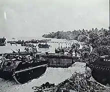 The attack group arrived in the transport area at 06:05 on 20 March. The LVTs were launched, and the assault troops transferred to the amphibious tractors using the APDs' boats, supplemented by those from Callaway while Vought F4U Corsairs of VMF-218 flew overhead to make a last-minute check of the island for any signs of the Japanese. The assault waves touched down on schedule. The reserve 3rd Battalion's boats grounded on the reef soon afterwards, and its marines waded ashore through knee deep water. The only problem encountered was with launching the LCTs carrying the tanks. The LSD's flooding mechanism failed and the LCTs had to be dragged out by a fleet tug.[13] While the detachment sent to occupy Elomusao Island was approaching the beach, some supposed opposition caused the amphibious tractors and then a destroyer to open fire, and a man was wounded by a shell fragment. However, the natives informed the marines that the Japanese had left Emirau two months before and only a small detachment remained on Mussau Island.[14] Supplies began landing at around 1100, first from the APDs and then from Callaway. Some 3,727 troops and 844 tons of cargo were ashore were by nightfall, when the ships sailed.[13] Within a month, some 18,000 men and 44,000 tons of supplies had been landed.[6]