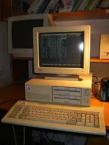 The Leading Edge Model D is an IBM clone first released by Leading Edge Hardware in July 1985. It was initially priced at $1,495 and configured with dual 5.25" floppy drives, 256 KB of RAM, and a monochrome monitor. It was manufactured by South Korean conglomerate Daewoo and distributed by Canton, Massachusetts-based Leading Edge.[1] Engineer Stephen Kahng spent about four months designing the Model D[2] at a cost of $200,000.[3] Kahng later became CEO of Macintosh clone maker Power Computing.