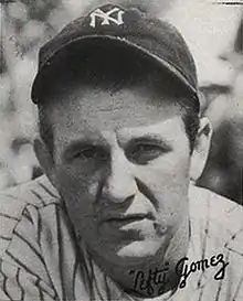 The New York Yankees purchased Gomez from the Seals for an estimated $39,000.[3] He reported in at 6 feet 2 inches (1.88 m) and weighing in at 147 pounds (67 kg). This scared many people that he was not ready for the big leagues. Gomez made his major league debut on April 29, 1930. He pitched in only 15 games and finished the season with a 2–5 win–loss record, a 5.55 earned run average (ERA). Coming into the 1931 season, Gomez had good pitching velocity, but the Yankees were concerned about the pitcher's slender frame of 6 feet 2 inches (1.88 m) and 155 pounds (70 kg). Following a common medical strategy of the time, the team had most of his teeth extracted; they also had him drink three quarts of milk daily and gave him an unlimited meal allowance for road games. Gomez registered the second-best ERA in the American League in 1931.[4]