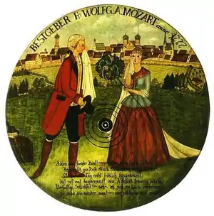 Wolfgang left home permanently in 1781 (see below), and from this time until 1784, his father lived in Salzburg with just Nannerl (now in her early thirties) and their servants. Nannerl had a number of suitors,[22] of whom the most important was Franz Armand d'Ippold, with whom she was evidently in love. In the end she did not marry him, and the reason for this is unknown. One possibility, frequently entertained by biographers,[23] is that the marriage was blocked by Leopold, who liked having Nannerl at home as the lady of the house. However, Halliwell [24] observes that no written evidence on this point survives and insists that we simply do not know why Nannerl married so late. Nannerl finally did marry in August 1784, at age 33. She moved to the home of her new husband, Johann Baptist Franz von Berchtold zu Sonnenburg, in the small rural town of St. Gilgen, roughly six hours journey east of Salzburg.[25]