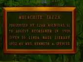 "The Tazza", one of the largest pieces of malachite in North America, stands as the focal point in the center of the main reading room, which features parquet wood floors, paneling and bookshelves of oak, and large windows that overlook the south lawn.