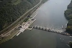 Lock and Dam No. 9 is a lock and dam located near Lynxville, Wisconsin and Harpers Ferry, Iowa on the Upper Mississippi River around river mile 647.9. The lower portion of Pool 9 was formally named Lake Winneshiek. The normal pool elevation behind the dam is 620 feet (189.0 m). It was constructed and placed in operation in July 1937. The site underwent a major rehabilitation from 1989 and 2006. The dam consists of concrete structure 811 feet (247.2 m) long with five roller gates and eight tainter gates. Earth embankment 9,800 feet (2,987.0 m) long with a grouted overflow spillway 1,350 feet (411.5 m) long. The lock is 110 feet (33.5 m) wide by 600 feet (182.9 m) long. Lock and Dam No. 9 is located 12 miles upstream from Prairie du Chien, Wisconsin.[1] The lock and dam are owned and operated by the St. Paul District of the United States Army Corps of Engineers-Mississippi Valley Division.