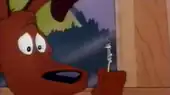 Smidgen runs into the cabin, grabs the horn and gives several blows that alert a nearby moose. The normal-sized moose happily runs after what it believes is another moose, only to find in waiting an enormous dog. The moose instantly flees, yelping like a dog. Smidgen gives the horn another blow, sending Bugs flying into the barrel of a revolver. Smidgen fires it, sending the bullet Bugs is riding on into a nearby apple in a fruit basket. Smidgen grabs the apple and takes a large bite, leaving Bugs' lower half exposed. Smidgen then eats the entire apple, grabs a toothpick to pick his teeth, and walks away, seemingly feeling assured that Bugs has been eaten and taken care of. As Smidgen picks his teeth, Bugs comes out unharmed on the top of the toothpick. Bugs then hops up, grabs Smidgen's ear, and wraps the ear around Smidgen's head, covering his eyes.