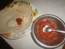 Lunumiris (Sinhala:ලුණු මිරිස් [lunu-miris] means salt and chillies in Sinhalese. Traditionally it is made with ground chillies and salt mixed together into a paste. Some also refer it as "Katta Sambal" but Katta sambal or sambol has Maldives fish in the recipe along with shallots and salt. [Sinhala:කට්ට සම්බෝල [kaṭṭa sambōla]]) is a spicy Sri Lankan sambal paste served as a condiment. It consists of chili pepper, shallots, Maldives fish, sea salt, black pepper and lime juice, usually ground with a mortar and pestle or a grind stone.