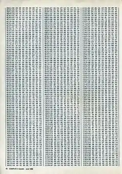 MLX was introduced in the December 1983 issue of COMPUTE! for the Commodore 64 and Atari 8-bit family.[1] This was followed in the January 1984 issue of COMPUTE!'s Gazette by a version for the VIC-20 with 8K expansion,[2] and in the March 1984 issue by Tiny MLX, a version for the unexpanded VIC-20.[3] These use a format consisting of six data bytes in decimal format, and a seventh as a checksum. The program auto-increments the address and prints the comma delimiters every three characters. Invalid keystrokes are ignored.