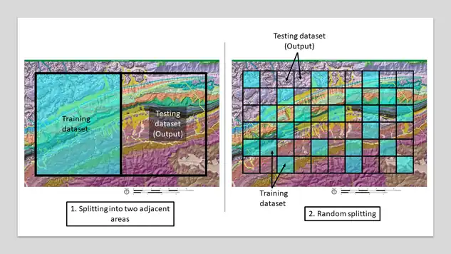As the training of machine learning for landslide susceptibility mapping requires both training and testing dataset, therefore splitting of the dataset is required. Two splitting methods for the datasets are presented on the geologic map of the east Cumberland Gap. The method presented on the left, 'Splitting into two adjacent areas' is more useful as the automation algorithm can carry out mapping of a new area with the input of expert processed data of adjacent land. The cyan coloured pixels show the training dataset while the remaining shows the testing datasets.