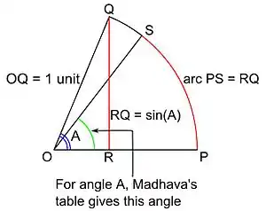 To understand the meaning of the values tabulated by Madhava, consider some angle whose measure is A. Consider a circle of unit radius and center O. Let the arc PQ of the circle subtend an angle A at the center O. Drop the perpendicular QR from Q to OP; then the length of the line segment RQ is the value of the trigonometric sine of the angle A. Let PS be an arc of the circle whose length is equal to the length of the segment RQ. For various angles A, Madhava's table gives the measures of the corresponding angles POS in arcminutes, arcseconds and sixtieths of an arcsecond.