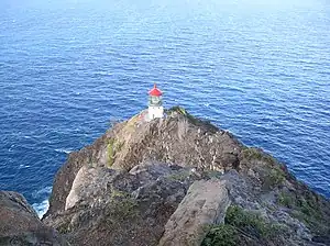 Makapuʻu Point (also Makapuu Point) is the easternmost point on the Hawaiian island of Oʻahu, located in the Makapuʻu region. Twelve miles east of Honolulu, it is a popular hiking spot, offering great views of Makapuʻu and Waimanalo Bay on one side and the Ka ʻIwi Channel on the other side. It is the home of the Makapuʻu Point Light, which was established in 1909; the light was automated in 1974. Containing one of the world's largest Fresnel lenses. According to Neal McHenry the procedure to produce another 12-foot (3.7 m) high Hyper-Radiant Fresnel Lens is no longer known. The Light House is lit by a single 1000 watt 120 volt alternating current lamp. Should the first lamp burn out a tangent lamp will automatically rotate into place. The light house and the area around it is owned by the U.S. Coast Guard.