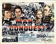 Man of Conquest is a 1939 American Western film directed by George Nicholls Jr. and starring Richard Dix, Gail Patrick, and Joan Fontaine. The film was nominated for three Academy Awards for Best Score, Best Sound (Charles L. Lootens), and Best Art Direction (John Victor Mackay).[2]