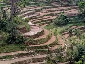 The Kumaon[12] region consists of a large Himalayan tract, together with two submontane strips called the Terai and the Bhabar. The submontane strips were up to 1850 an almost impenetrable forest, given up to wild animals; but after 1850 the numerous clearings attracted a large population from the hills, who cultivated the rich soil during the hot and cold seasons, returning to the hills in the rains. The rest of Kumaon is a maze of mountains, part of the Himalaya range, some of which are among the loftiest known. In a tract not more than 225 km in length and 65 km in breadth there are over thirty peaks rising to elevations exceeding 5500 m.[13]