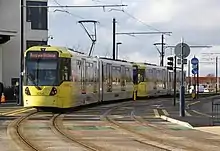 The network consists of eight lines which radiate from Manchester city centre to termini at Altrincham, Ashton-under-Lyne, Bury, East Didsbury, Eccles, Manchester Airport, Rochdale and The Trafford Centre. It runs on a mixture of on-street track shared with other traffic; reserved track sections segregated from other traffic, and converted former railway lines.[14] Metrolink is operated by a fleet of 147 high-floor Bombardier M5000 light rail vehicles.[15][16] Each service runs to a 12-minute headway; stops with more than one service experience combined headways of 6 minutes or less.[17] At the busiest times some services operate as 'doubles', with two vehicles coupled together.[15]