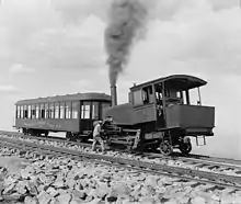 Three steam locomotives were built for the line by the Baldwin Locomotive Works that each featured boilers offset by 16 degrees to keep them level on the steeply inclined grades. While most locomotives pull rail cars, these steam engines would push the line's wooden passenger cars up the mountain, decreasing the chance of a runaway car.