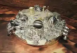 The Schiaparelli lander was intended to test technology for future soft landings on the surface of Mars as part of the ExoMars project. It was built in Italy by the European Space Agency (ESA) and Roscosmos. It was launched together with the ExoMars Trace Gas Orbiter (TGO) on 14 March 2016 and attempted a landing on 19 October 2016. Telemetry was lost about one minute before the scheduled landing time,[24] but confirmed that most elements of the landing plan, including heat shield operation, parachute deployment, and rocket activation, had been successful.[25] The Mars Reconnaissance Orbiter later captured imagery showing what appears to be Schiaparelli's crash site.[26]