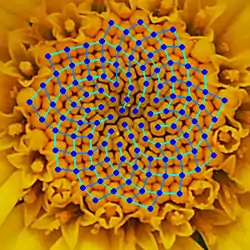 Yellow chamomile head showing the Fibonacci numbers in spirals consisting of 21 (blue) and 13 (aqua). Such arrangements have been noticed since the Middle Ages and can be used to make mathematical models of a wide variety of plants.