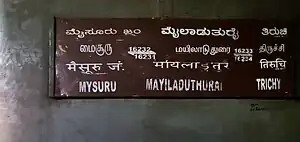 Some of the prominent stoppages include Kumbakonam, Thanjavur Junction, Tiruchchirappalli Junction, Erode Junction, Salem Junction, Hosur and Bangalore City. This daily train numbered 16231 departs, Mayiladuthurai Junction every evening as "Mysore Express", reverses loco twice at Tiruchirappalli Junction and Erode Junction arrives Mysore Junction next morning.[18] In the return journey, the train departs Mysore Junction as "Mayiladuthurai Express", numbered 16232 during late noon, follows the same route and reverses loco twice at Erode Junction and Tiruchirappalli Junction arrives Mayiladuthurai Junction next morning.[19][lower-alpha 1]