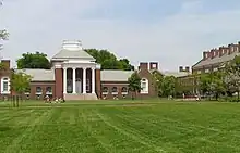 Memorial Hall is a symmetrical H-shaped building with one and a half stories and a full basement. It was designed by the Philadelphia firm of Day & Klauder as part of their overall campus master plan, which was drafted in 1917 with later revisions. The building features a Georgian Revival architectural style "reminiscent of Jefferson's designs for the University of Virginia", with exterior walls of Flemish bond brickwork and white wooden trim.[1] The majority of the windows are double-hung 12 over 12 sash windows, some of which are set in arched frames. Both the north and south facades of the building feature flat-roofed porticoes with Ionic columns. As originally built in 1924, the building consisted of only the hipped-roofed central hall and cupola with low wings on the east and west sides. During the 1940 rebuilding the central hall was expanded to the south to provide a new above-ground space for the library stacks, and gable-roofed extensions were added to the east and west wings.[1]