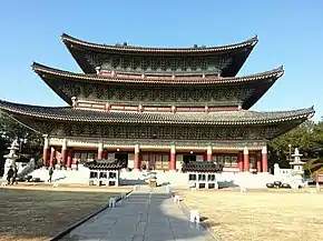 The shaman worships their mengdu every day by offering libations and burning candles and incense in the dangju.[105] Every year, the shaman also holds the Dangju-je, a series of three ceremonies specifically dedicated to the mengdu ancestors. These are held on the eighth, eighteenth, and twenty-eighth days of the ninth lunisolar month, roughly October, corresponding to the birthdays of the Mengdu triplets in the Chogong bon-puri.[105] As they involve the creation and elimination of the dangju as a sacred space, the first and last Dangju-je of a shaman's life have special names: Dangju-mueum ("adorning the dangju") and Dangju-jium ("erasing the dangju"). The Dangju-jium may be held after death by another shaman. When a living shaman holds it, it signifies that they are passing down their mengdu to their chosen heir and retiring from ritual practice.[106]