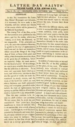 The May 1835 issue was the last with Cowdery as editor, because there was "other business and other duties, in which my services are requisite." John Whitmer replaced Cowdery as editor.[2] Whitmer may have been heavily assisted in his duties by W. W. Phelps.[3]