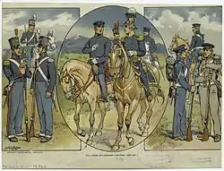 The war was fought by regiments of regulars and various regiments, battalions, and companies of volunteers from the different states of the Union as well as Americans and some Mexicans in California and New Mexico. On the West Coast, the U.S. Navy fielded a battalion of sailors, in an attempt to recapture Los Angeles.[55] Although the U.S. Army and Navy were not large at the outbreak of the war, the officers were generally well trained and the numbers of enlisted men fairly large compared to Mexico's. At the beginning of the war, the U.S. Army had eight regiments of infantry (three battalions each), four artillery regiments and three mounted regiments (two dragoons, one of mounted rifles). These regiments were supplemented by 10 new regiments (nine of infantry and one of cavalry) raised for one year of service by the act of Congress from February 11, 1847.[56] A large portion of this fighting force consisted of recent immigrants. According to Tyler V. Johnson, foreign-born men amounted to 47 percent of General Taylor's total forces. In addition to a large contingent of Irish- and German-born soldiers, nearly all European states and principalities were represented. It is estimated that the U.S. Army further included 1,500 men from British North America, including French Canadians.[57][58]