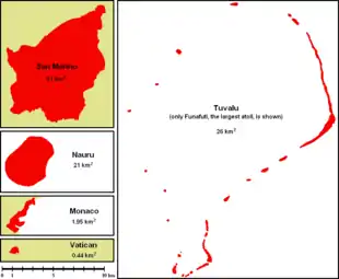 The world's five smallest sovereign states by area, from largest to smallest: San Marino, Tuvalu, Nauru, Monaco, and Vatican City shown in the same scale for size comparison