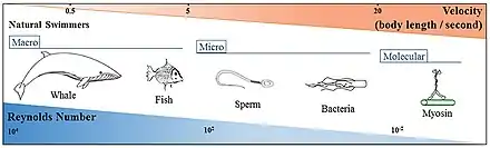 It is a direct consequence of the small size scale of microswimmers that they have a low Reynolds number. This means the physics of how microswimmers swim is dominated by viscous drag forces, a problem which has been discussed extensively by physicists in the field.[90][94][95] This kind of swimming has challenged engineers as it is not commonly experienced in everyday life, but can nonetheless be observed in nature for motile microorganisms like sperm or certain bacteria. Naturally, these microorganisms served as inspiration from the very beginning to create artificial micromotors, as they were able to tackle the challenges that an active, self-sufficient microswimmer vehicle has to face.[96] With biomimetic approaches, researchers were able to imitate the flagella-based motion strategy of sperm and Escherichia coli bacteria by reproducing their respective flagellum shape and actuating it with magnetic fields.[97][98][65][15]