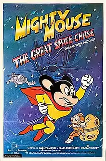 The serialized Mighty Mouse story "The Great Space Chase" from The New Adventures of Mighty Mouse and Heckle & Jeckle seen on the popular Saturday morning series was re-edited into a 1982 superhero comedy film by Filmation.[1]