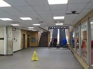 Buses use the upper level, while access from the mall is on lower ground via crosswalk (no direct connection), where a taxi stand and kiss and ride are located. Services provided on the upper level of the building include ticket sales, information booth, and lost and found, while washroom facilities and MiWay transit police holding cells is located on the lower level. The terminal is accessible by both elevator and escalator.