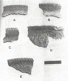 Further excavations were conducted in 2002 to further clarify questions about the subsistence patterns and site function.[21][22] Further examples of Moccasin Bluff Ware were recovered; Moccasin Bluff Plain Modified Lip, Moccasin Bluff Impressed Exterior Lip, Moccasin Bluff Scalloped, Moccasin Bluff Cordmarked, and Moccasin Bluff Plain.[22] In addition, there were vessels recovered from the Middle Woodland and also a partially reconstructed vessel from the Early Woodland, a poorly represented time period in the 1948 excavations.[22]