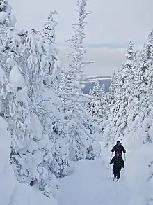 Ascent of Mount Logan is possible when the ground is clear of snow, from late June to late September. The trails are isolated and rarely frequented.[54][55][56] The hike generally requires overnight camping.[54] Climbing the mountain is also possible from the west, via the international Appalachian trail from the Cap-Chat River valley. The round trip requires two to three days of hiking.[57] From the east, it is possible to take a forest path or a steep path.[55] In order to shorten the route, one can take a shuttle from Cap-Chat.[57] or the Mont Albert.[54]