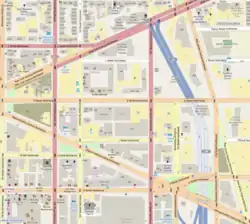 Commercial development increased in the neighborhood in the 1910s and 1920s. Increased traffic on New York Avenue resulted in the addition of gas stations, garages and car repair shops, many of which replaced residential buildings. By 1930, Northern Liberty Market (called Center Market at the time) was under threat of closing and demolition. A new and modern building for vendors was built on the opposite corner. As the number of commercial and industrial businesses increased, many residents moved elsewhere. Many homes became boarding houses for poor residents, a trend that significantly increased following World War II. In 1946, a fire destroyed much of Center Market, resulting in many local businesses supported by the market to close or move to other parts of the city. The streetcar on New York Avenue was removed in 1949 and many of the residential buildings along that road were demolished and replaced with parking lots. In the 1960s, a large portion of the neighborhood's eastern section, including the remaining portion of Douglas Row, was demolished to make room for Interstate 395. During the 1968 riots that followed the assassination of Martin Luther King Jr., several buildings on the west side of Mount Vernon Triangle were burned.[3] By the 1980s, much of the neighborhood was decrepit, consisted of large parking lots and had become a haven for prostitutes and drug dealers.[4][5][6]