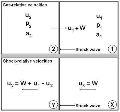 To derive the theoretical equations for a moving shock, one may start by denoting the region in front of the shock as subscript 1, with the subscript 2 defining the region behind the shock. This is shown in the figure, with the shock wave propagating to the right. The velocity of the gas is denoted by u, pressure by p, and the local speed of sound by a. The speed of the shock wave relative to the gas is W, making the total velocity equal to u1 + W.