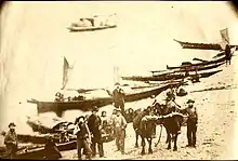 A photograph of American settlers and Native Americans on the beach in Mukilteo, c. 1861–62