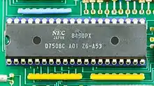 The μCOM-80 (μPD8080A) is an 8-bit microprocessor that is pin-compatible with the Intel 8080 and software-compatible with the μCOM-8. That is, the μPD8080A has some improvements compared to the Intel 8080:[5]: 150