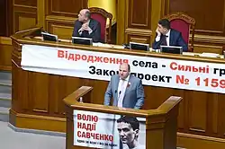 In late November 2014, Savchenko signed her parliamentary oath and passed it to Ukraine through her lawyer and was thus sworn in as People's Deputy of Ukraine (MP) on 27 November 2014.[16][79]