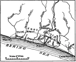 This was one of the first and was the biggest Alaskan gold rush in North America, only the California and Klondike gold rushes were larger. A chaotic and lawless scene ensued, with rampant claim-jumping, crooked judges, and not enough gold found for the 20,000 prospectors, gamblers, shop and saloon-keepers, and prostitutes living in the tent city on the beachfront tundra, at least not at first.[1] Then someone thought to pan the red-and-black streaked beach sands. Within days, gold was found for tens of miles up and down the beach from Nome. More than a million dollars' worth of gold was taken from the beach in 1899. Subsequently the second and third beach lines were discovered and mined. Anvil Creek produced the second-largest gold nugget found in Alaska (182 troy ounces), as well as the 6th, 7th, 9th, and 10th-largest.[2][3]