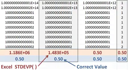 Both the "compatibility" function STDEVP and the "consistency" function STDEV.P in Excel 2010 return the 0.5 population standard deviation for the given set of values. However, numerical inaccuracy still can be shown using this example by extending the existing figure to include 1015, whereupon the erroneous standard deviation found by Excel 2010 will be zero.