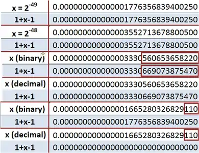 The last two examples illustrate what happens if x is a rather small number. In the second from last example, x = 1.110111⋯111 × 2−50  ; 15 bits altogether. The binary is replaced very crudely by a single power of 2 (in this example, 2−49) and its decimal equivalent is used. In the bottom example, a decimal identical with the binary above to the precision shown, is nonetheless approximated differently from the binary, and is eliminated by truncation to 15 significant figures, making no contribution to 1 + x − 1 , leading to x = 0 .[lower-alpha 2]
