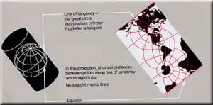 - Both projections are cylindrical: for the Normal Mercator, the axis of the cylinder coincides with the polar axis and the line of tangency with the equator. For the transverse Mercator, the axis of the cylinder lies in the equatorial plane, and the line of tangency is any chosen meridian, thereby designated the central meridian.