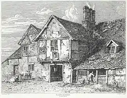 The Old Swan, stands on the corner of West and South Streets Rhayader. The original building was mentioned in 1676 as being one of the two inns in Rhayader at that date. Some changes were made in 1683, including the rebuilding of the three chimney stacks, and this date is carved into the old timbers inside the building. During the 1860s the Old Swan stopped trading as an inn, and it was used in later years as a hardware shop, a saddlers, a butcher's shop, and other businesses. Part of it was used as a Tourist Information Office for a time, and the section of the building on the corner is used as a teashop. The earliest depiction of the Old Swan is an engraving of 1815 by the artist Paul Sandby Munn. The engraving shows a porch that has been jettied forward at first floor level with a sign showing a swan. The building on the left, which appears to be a stable and clearly shows the Flagstone covered roof. The engraving shows the three stone chimney stacks on the west side of the porch roof, but as to-day they are on the east side, this must be a mistake by the artist. The open porch has now been replaced by a shop window. On the east side there is gable and to-day there is a wooden bracket showing the head of a woman with a ‘‘horned’’, late Medieval headress set into the gable.[2]