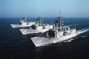 ![]() The frigates Oliver Hazard Perry, Antrim, and Jack Williams in 1982 | |