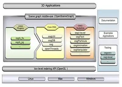 OpenSceneGraph is an open-source 3D graphics application programming interface (library or framework),[2] used by application developers in fields such as visual simulation, computer games, virtual reality, scientific visualization and modeling.