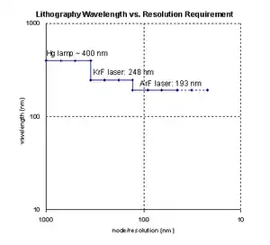 The ability to project a clear image of a small feature onto the wafer is limited by the wavelength of the light that is used, and the ability of the reduction lens system to capture enough diffraction orders from the illuminated mask. Current state-of-the-art photolithography tools use deep ultraviolet (DUV) light from excimer lasers with wavelengths of 248 (KrF) and 193 (ArF) nm (the dominant lithography technology today is thus also called "excimer laser lithography"), which allow minimum feature sizes down to 50 nm. Excimer laser lithography has thus played a critical role in the continued advance of the Moore's Law for the last 20 years (see below[20]).