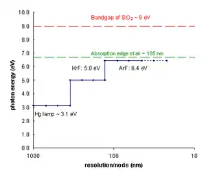 UV excimer lasers have been demonstrated to about 126 nm (for Ar2*). Mercury arc lamps are designed to maintain a steady DC current of 50 to 150 Volts, however excimer lasers have a higher resolution. Excimer lasers are gas-based light systems that are usually filled with inert and halide gases (Kr, Ar, Xe, F and Cl) that are charged by an electric field. The higher the frequency, the greater the resolution of the image. KrF lasers are able to function at a frequency of 4 kHz . In addition to running at a higher frequency, excimer lasers are compatible with more advanced machines than mercury arc lamps are. They are also able to operate from greater distances (up to 25 meters) and are able to maintain their accuracy with a series of mirrors and antireflective-coated lenses. By setting up multiple lasers and mirrors, the amount of energy loss is minimized, also since the lenses are coated with antireflective material, the light intensity remains relatively the same from when it left the laser to when it hits the wafer.[52]