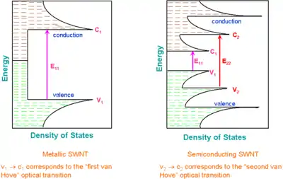 - The energies between the Van Hove singularities depend on the nanotube structure. Thus by varying this structure, one can tune the optoelectronic properties of carbon nanotube. Such fine tuning has been experimentally demonstrated using UV illumination of polymer-dispersed CNTs.[10]