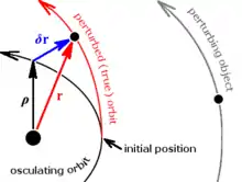Letting be the radius vector of the osculating orbit, the radius vector of the perturbed orbit, and the variation from the osculating orbit,
