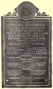 The Oregon Printing Association (OPA) was formed in Oregon City with the purpose of establishing a newspaper. The OPA consisted of a group of seven, including William G. T'Vault, James W. Nesmith, John P. Brooks, George Abernethy, John H. Couch, Robert Newell, and John E. Long.[4] It formally declared that the press they acquired was never to be used "...by any party for the purpose of propagating sectarian principles or doctrines; nor for the discussion of exclusive party politics." The group secured a press from New York.[5][6]